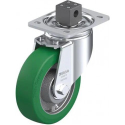 钢板压制万向脚轮, 重型负载设计, 带顶板配件, 配中央制动系统 'central-stop', 配 Blickle Softhane® 聚氨酯胎面的重型单轮, 配铸铁轮芯