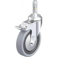 带螺栓孔配件的轻型万向脚轮, 配制动系统 'stop-fix', 配实心橡胶轮胎的单轮,采用塑料轮辋, 配钢制防线盖