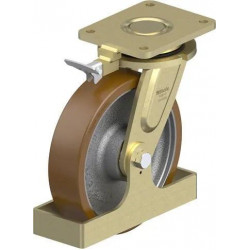 重型焊接钢万向脚轮, 重型万向头, 配定向制动器, 和钢制脚挡, 配 Blickle Besthane® 聚氨酯胎面的重型单轮, 配铸铁轮芯